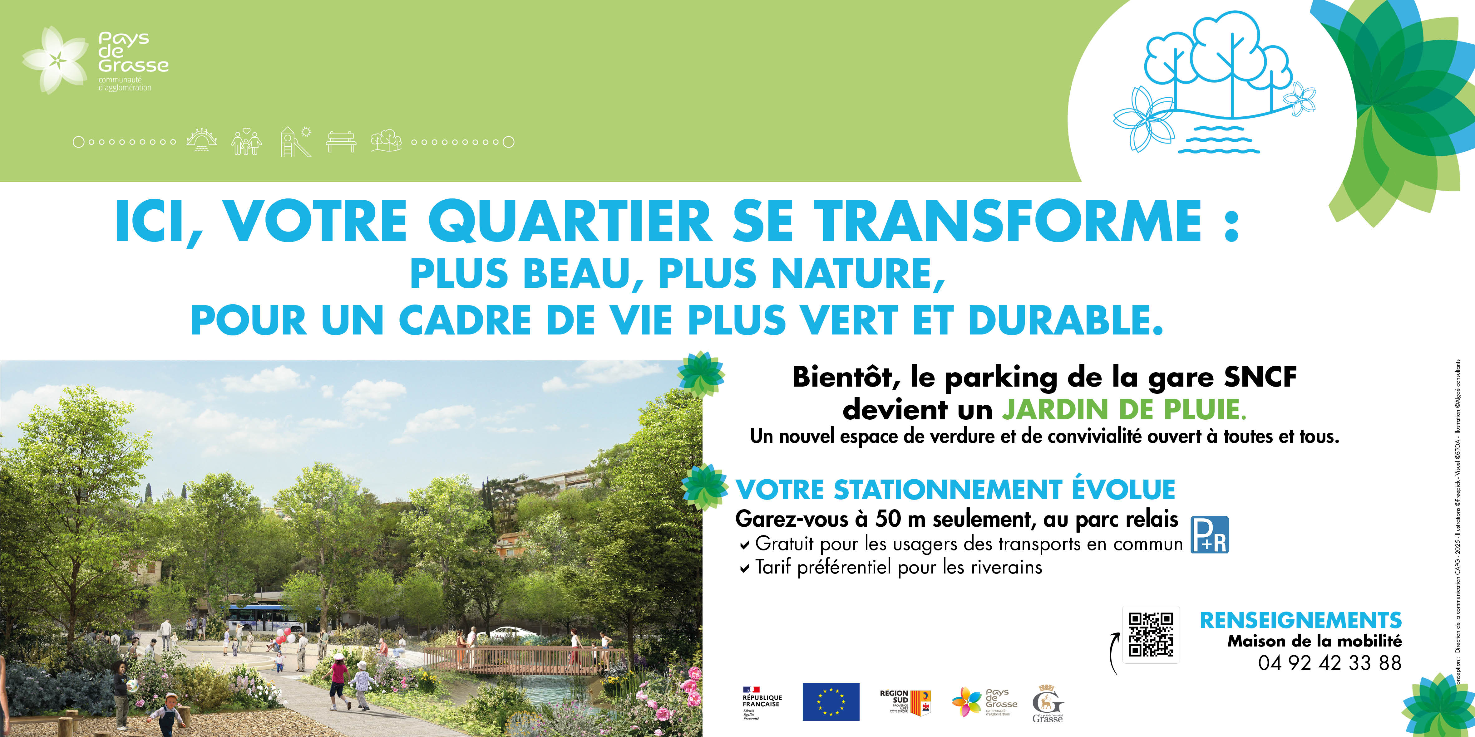 Dans le cadre de la transformation urbaine du quartier de la gare, le Pays de Grasse lance un projet ambitieux : le parking actuel de la SNCF, utilisé prioritairement par les usagers des transports en commun, va être converti en un Jardin de Pluie.